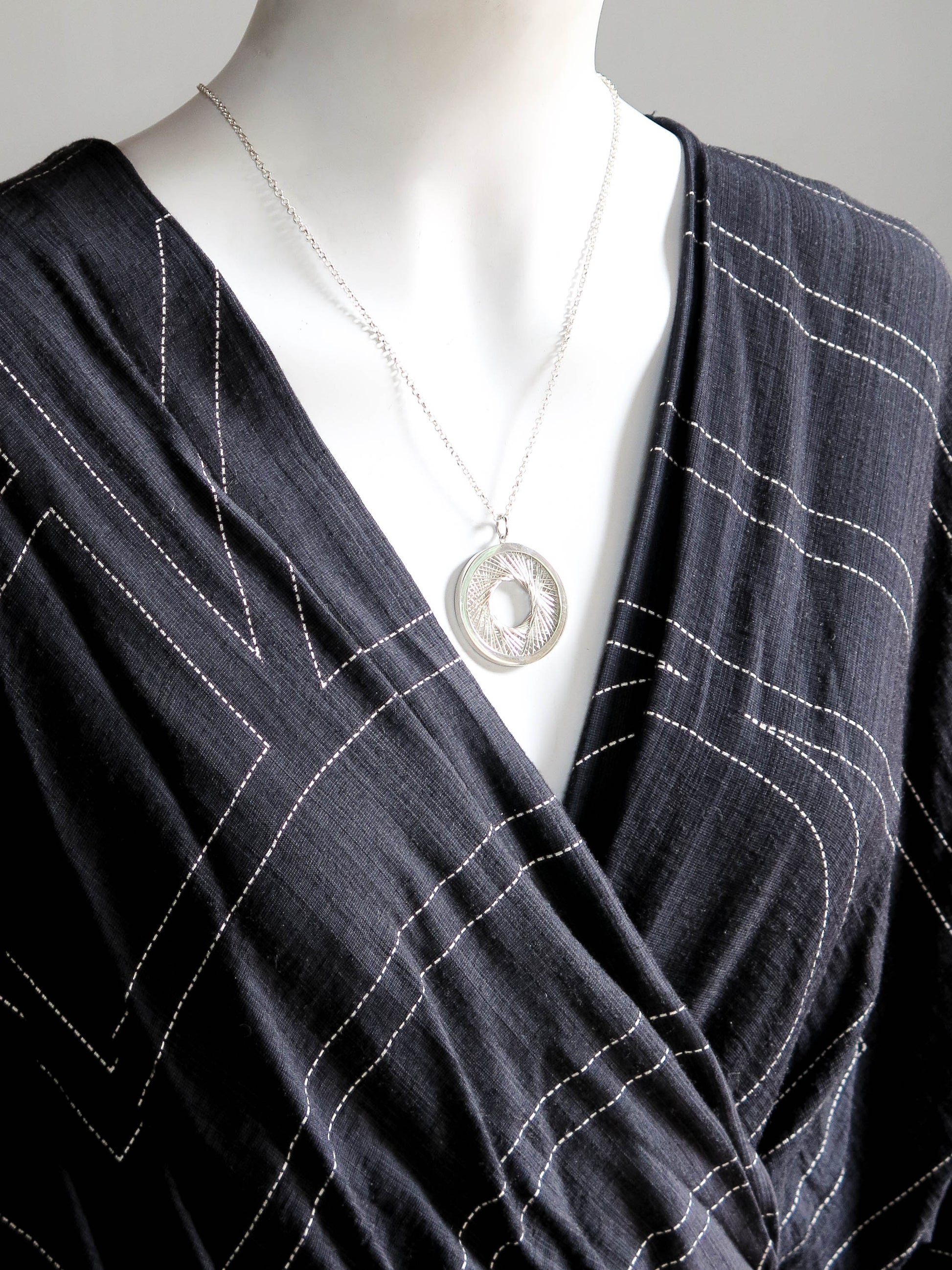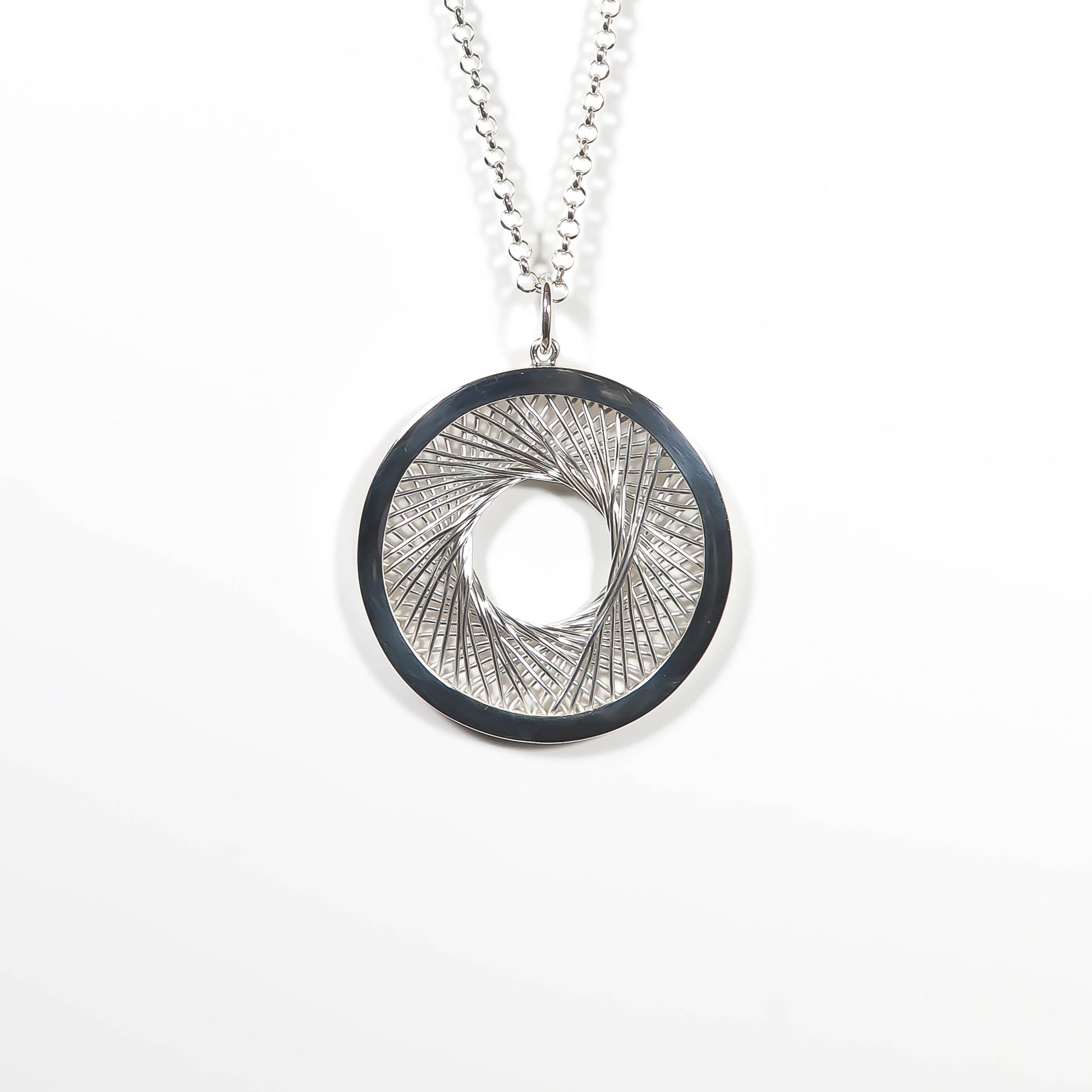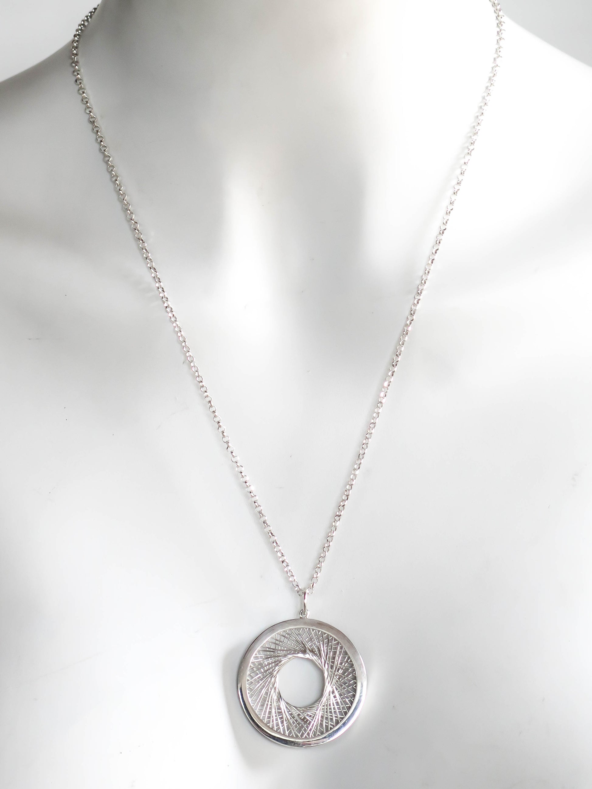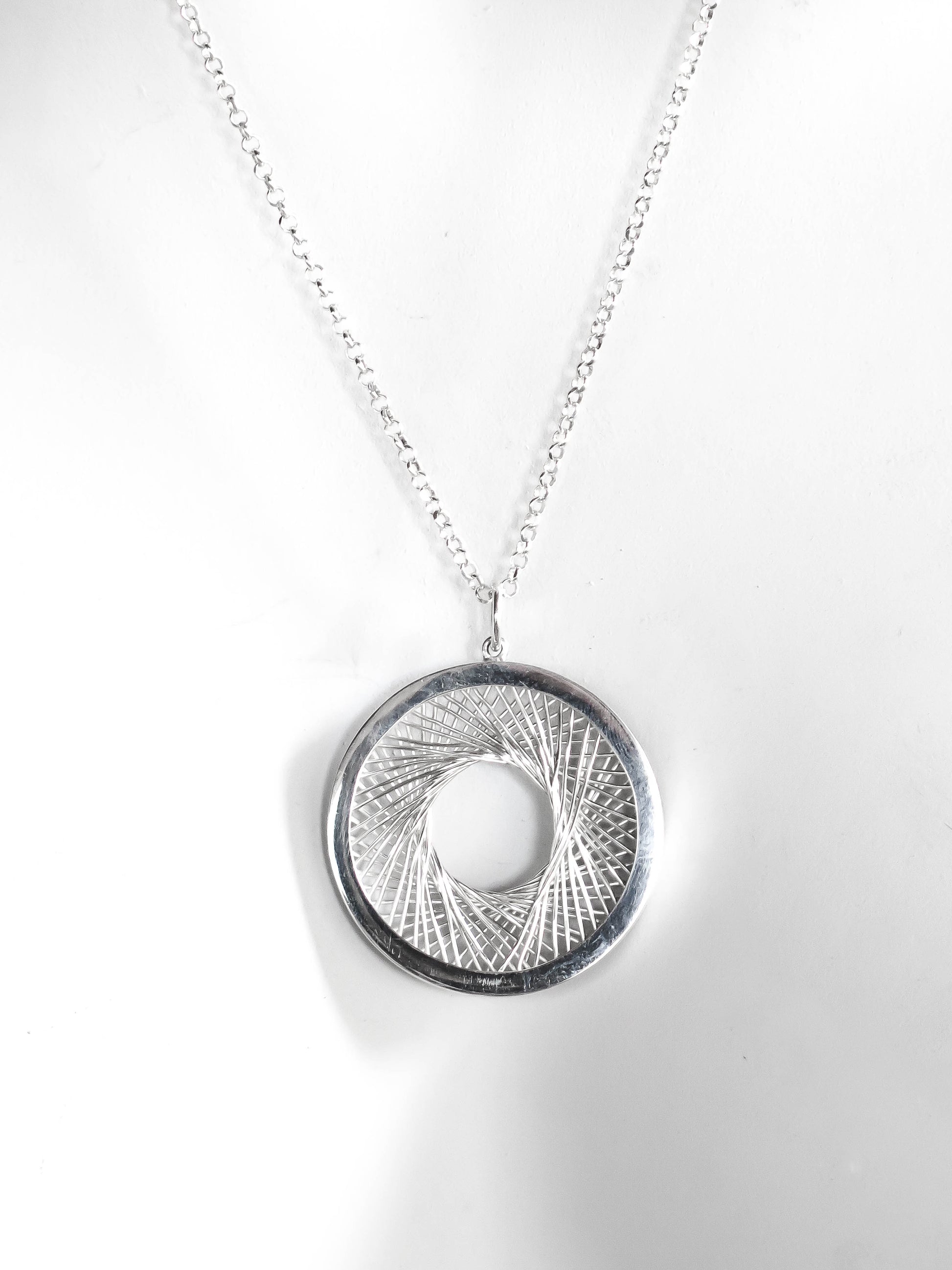 This piece was manufactured as a stand-alone project during my Advanced Diploma studies in 2023. The brief asked for a creative approach to the traditional filigree technique used in a variety of historical pieces in which wire shapes are bent and arranged as ornaments either on a closed back or an open back and soldered or fused in place. Inspired by the beautiful geometry of spirographs, I made a frame with equidistant spokes and wrapped fine silver wire around them to form a geometric structure reminiscent of a camera aperture. I then encapsulated the wire work in a solid sterling silver frame and paired it with a 55 cm sterling silver rolo chain to match the round shape of the pendant. The chain is included in this price.